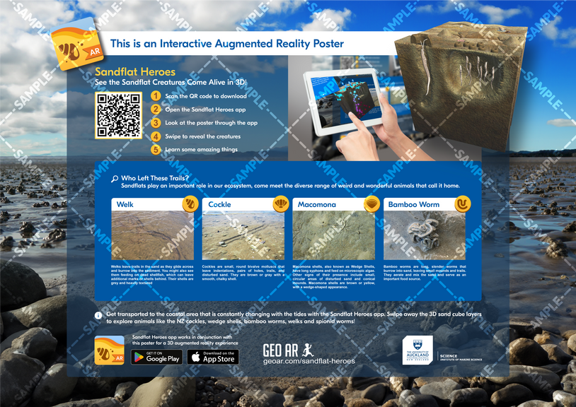 Sandflat Heroes is an augmented reality app developed with the New Zealand Marine Discovery Centre in Leigh and the University of Auckland. By scanning a poster or outdoor frame, players unlock a 3D cross section of sand where hidden creatures spring to life with facts and animations. Crabs burrow through the sediment, shellfish filter and clean the water, and bamboo worms push sediment around, bringing oxygen deep into the sand. Each of these creatures is a tiny engineer, working together to keep estuaries healthy and life in balance.